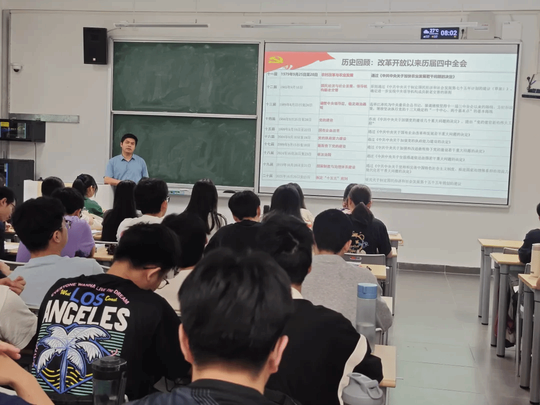 课上,他带领同学们回顾改革开放以来历届四中全会的重要部署,指出历届四中全会均立足时代大势、聚焦治国理政关键,为国家发展谋划战略部署,并勉励大家从党的历史与规划中汲取力量,把个人成长融入国家发展。李剑英强调,党的二十届四中全会对“十五五”时期经济社会发展作出顶层设计和战略擘画,“十五五”规划突出科技创新、绿色低碳与产业升级,车辆工程专业正是践行这些理念的重要领域。全会强调的高质量发展、科技自立自强为专业发展指明方向,也为青年学子带来时代机遇与责任。他希望大家深入学习领会党的二十届四中全会精神,将“十五五”规划要求融入学习实践,锤炼过硬本领,厚植家国情怀,以“强国有我”的担当投身汽车产业自主创新与绿色转型,为突破关键核心技术、建设粤港澳大湾区智能网联新能源汽车汽车产业贡献青春力量。