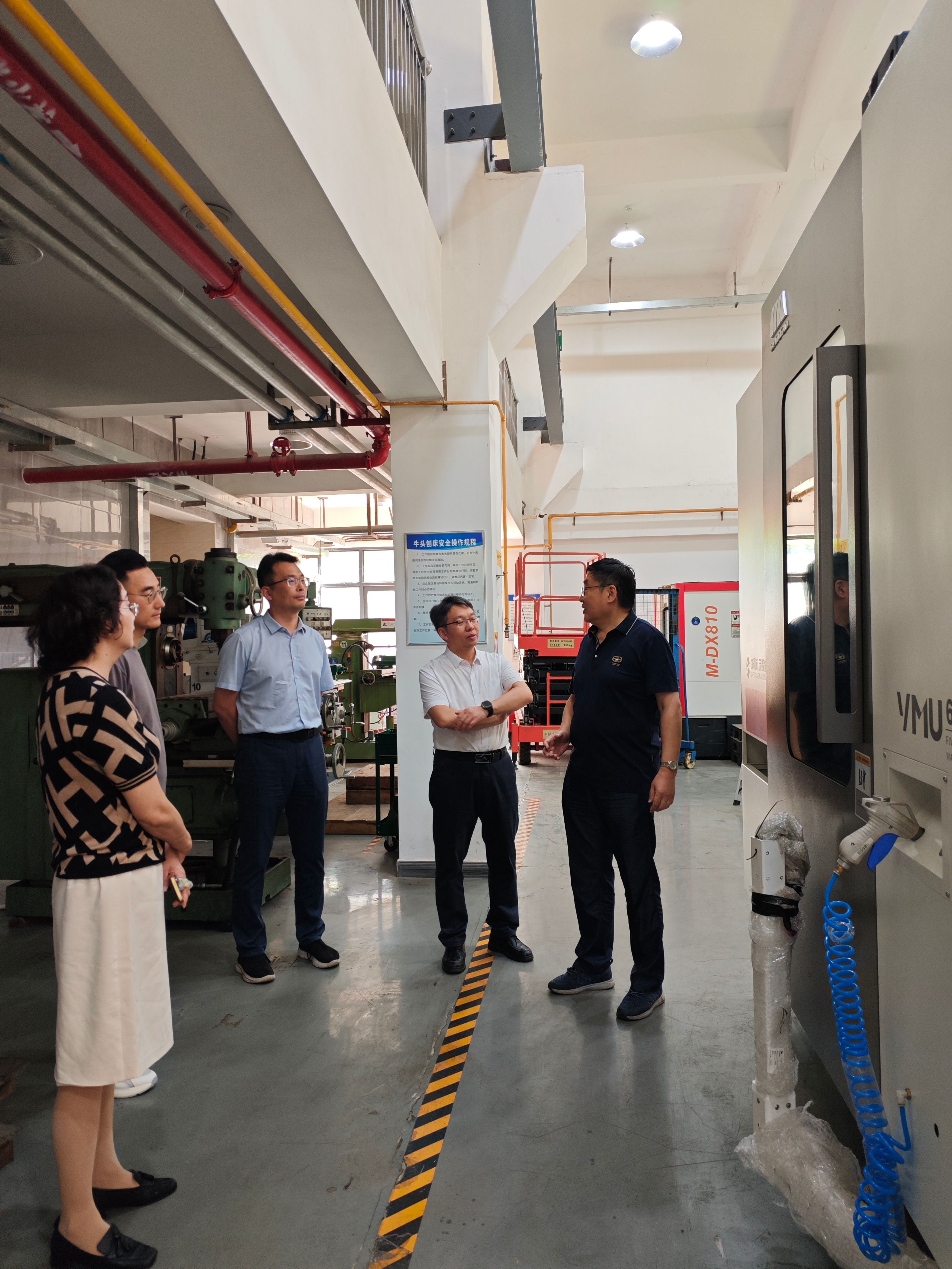 在张义民教授的引导下,杨坚局长一行参观了实验室的核心实验设备,包括液压试验台、多级齿轮传动测试平台、疲劳试验机及五轴联动数控机床等。张教授详细介绍了设备的功能定位及研发成果,重点强调实验室围绕新能源汽车及周边零部件产业需求,开展高端装备的动态设计、可靠性设计与轻量化设计等前沿技术攻关。