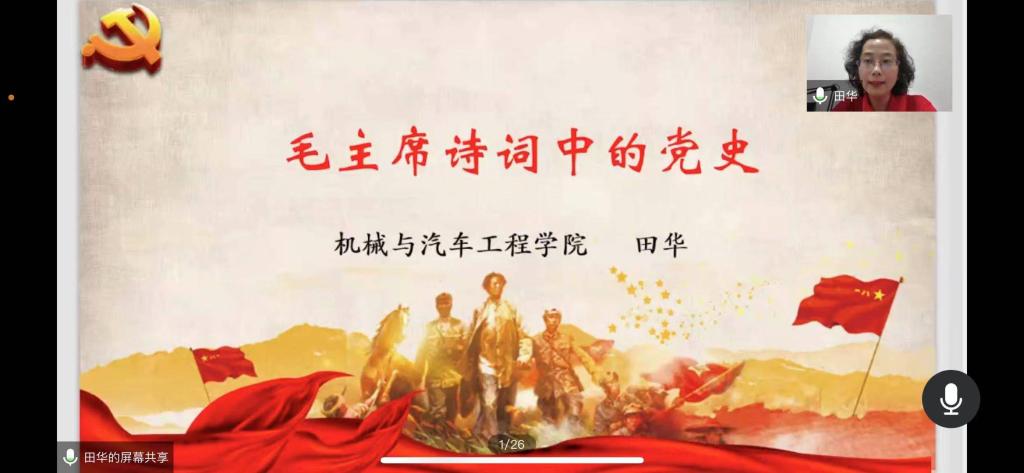 学院党委书记田华讲授 《毛主席诗词里的党史》专题党课。授课过程中,田华书记向同学们讲解了毛主席出生时期的时代背景、毛主席诗词里的党史和学习毛主席诗词的感悟。田书记以毛泽东创作的经典诗词为主线,带领大家重读毛主席诗词,理清毛主席领导的中国革命和中国共产党党史中的重大事项,探究中国革命和党史中的红色脉络。同时,结合习近平总书记系列重要讲话精神,让同学们在欣赏毛主席诗词磅礴气势和博大胸怀的同时,触摸到了党性之根,初心之源,更是以史鉴今,不忘初心,薪火相传。